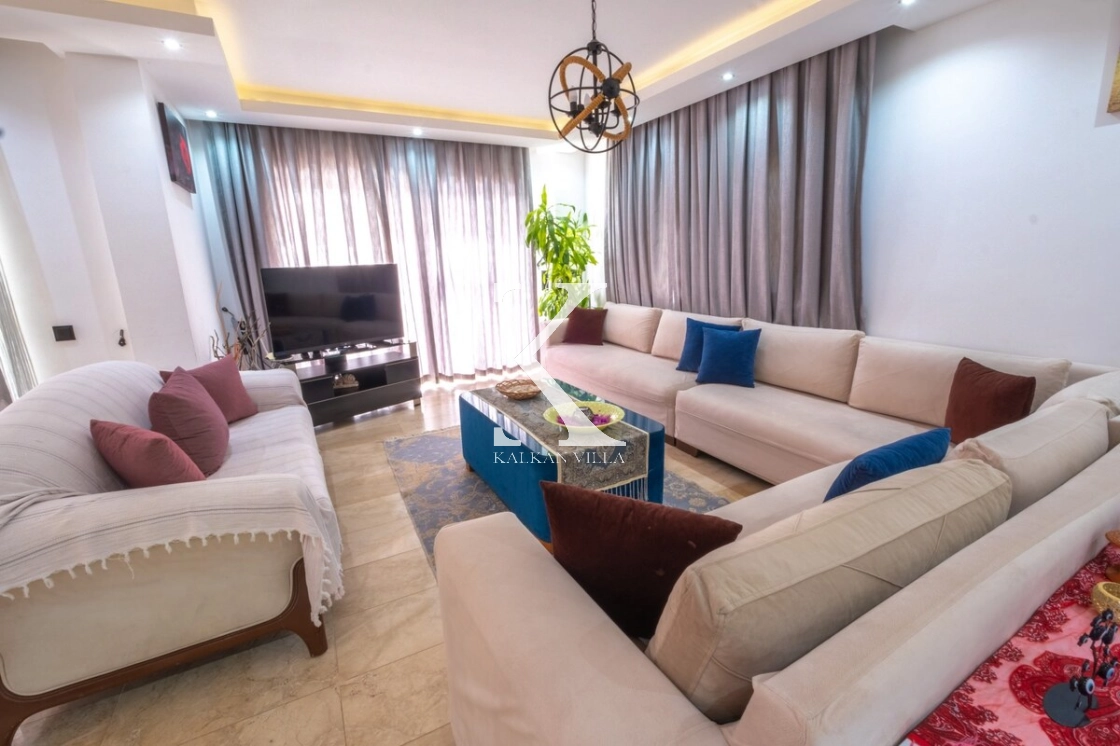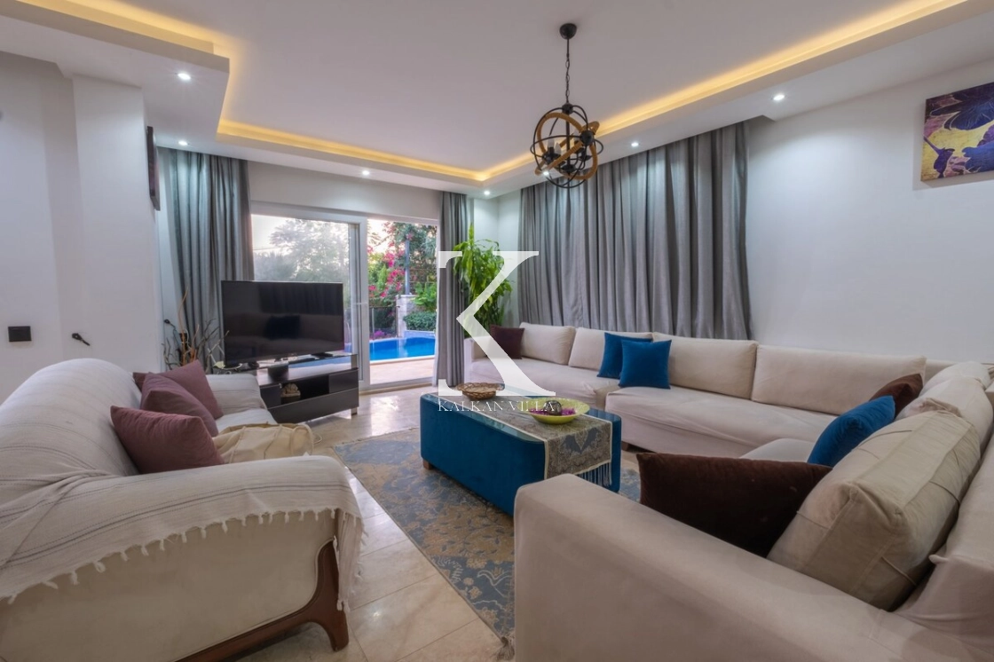 Villanın salonu modern ve lüks bir şekilde tasarlanmış olup konforlu bir yaşam alanı sunmaktadır.