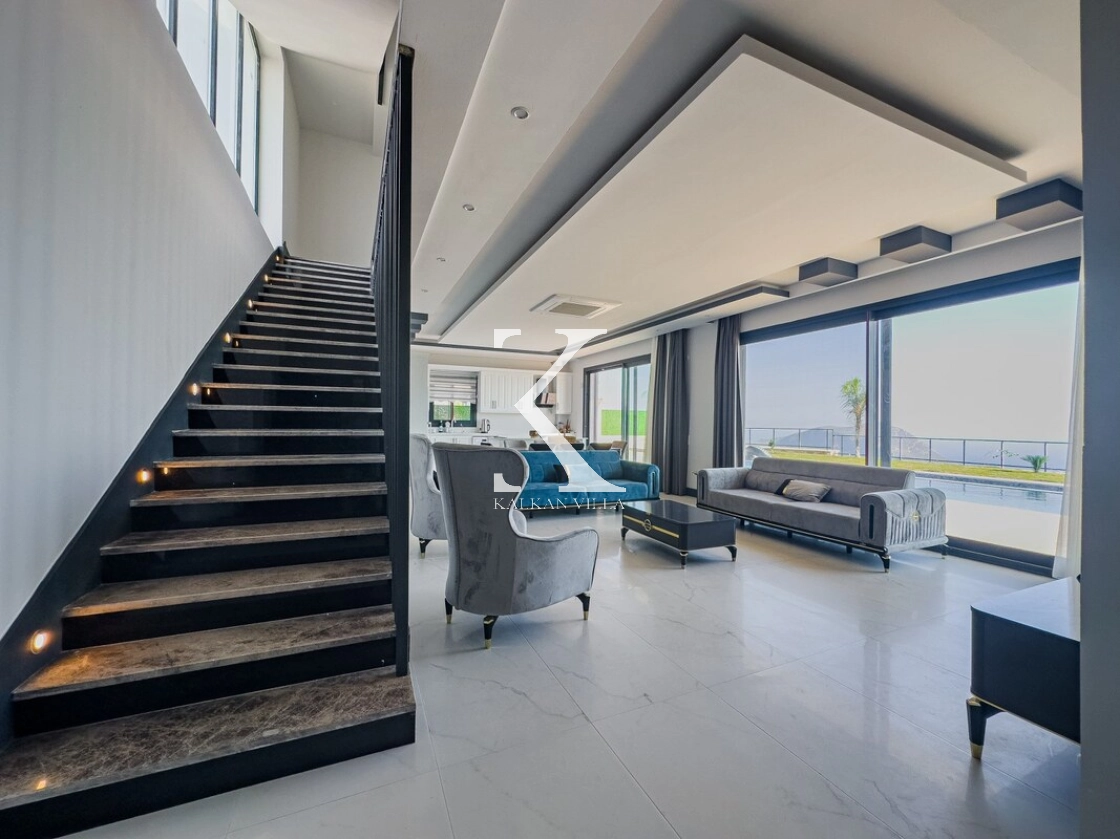 Yüksek tavanlı, deniz ve doğa manzarasına sahip modern salonda;
