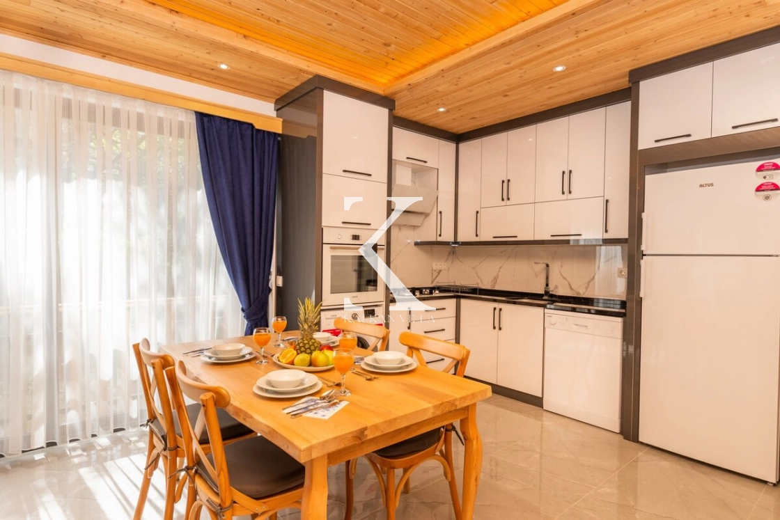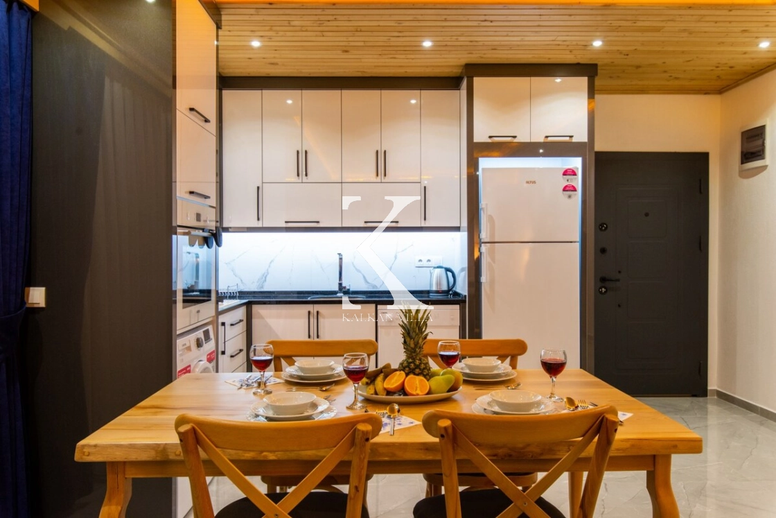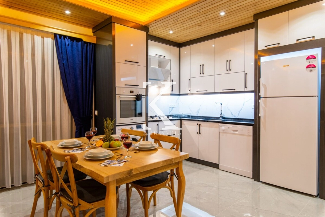 Ferah ve aydınlık Amerikan mutfak içerisinde; buzdolabı, tost makinesi, kahve makinesi, su sebili, bulaşık makinesi, fırın, 4’lü ankastre ocak, mikrodalga fırın, elektrikli su ısıtıcı, yemek pişirme takımları, mutfak ekipmanları, 4 kişilik yemek takımı ve çamaşır makinesi bulunmaktadır.