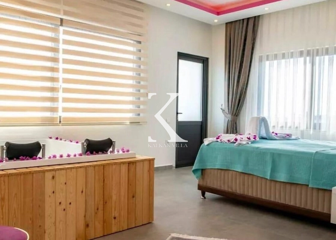 Jakuzili süit yatak odası, balayı çiftleri için romantik ve konforlu bir atmosfer sunar.