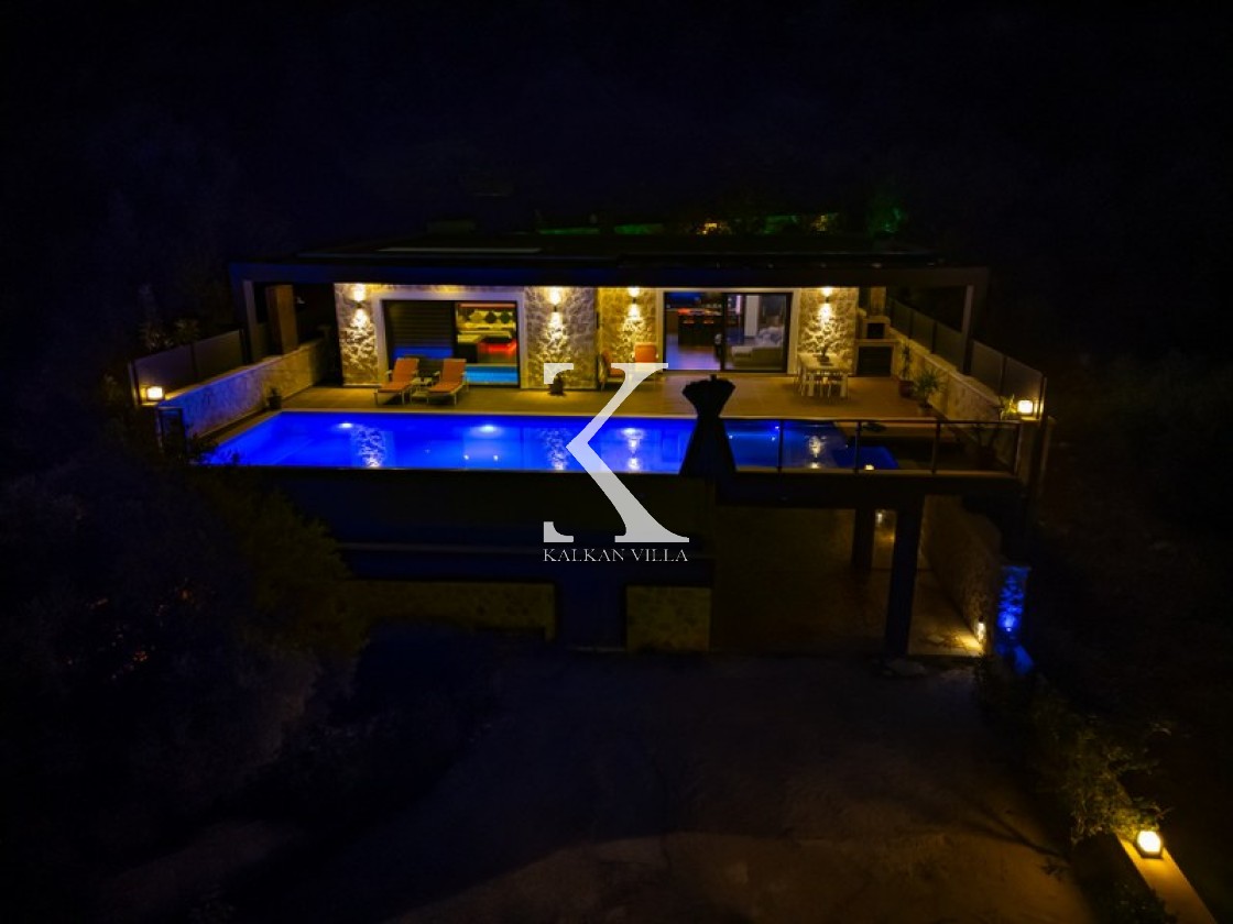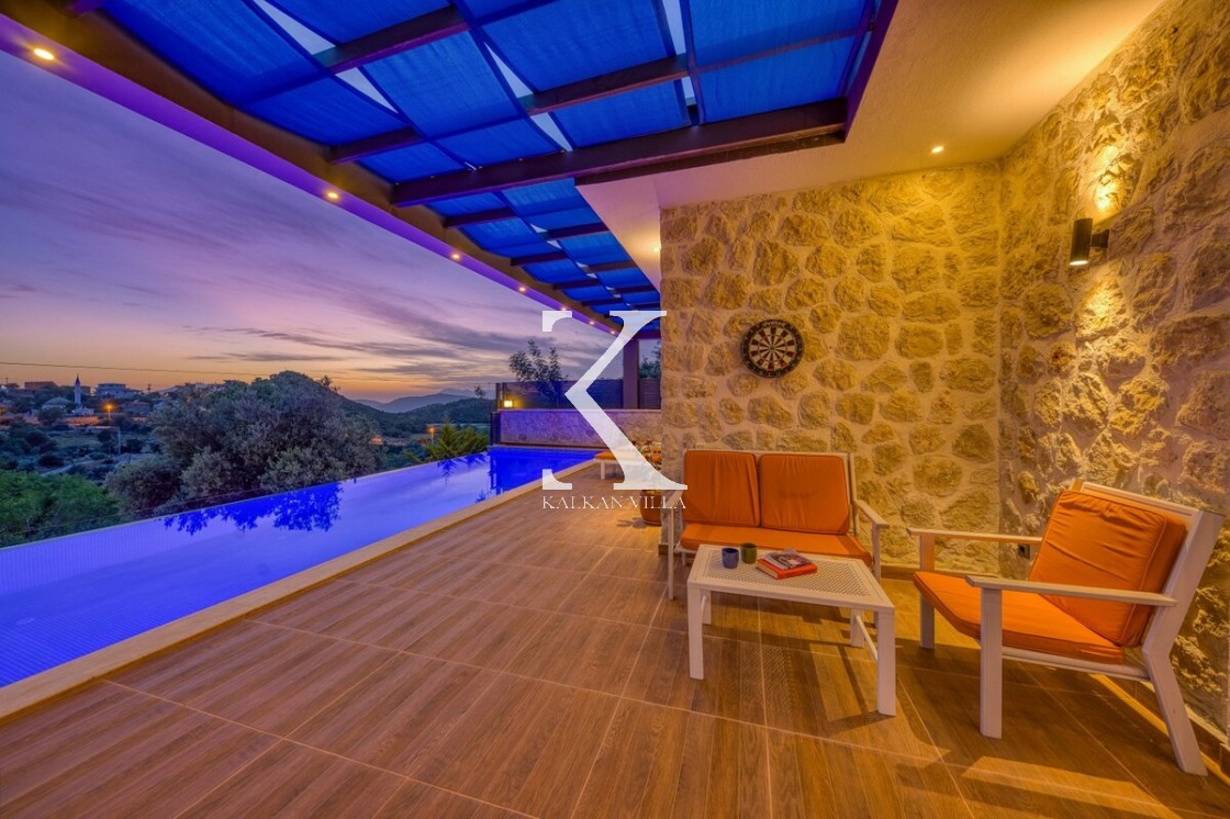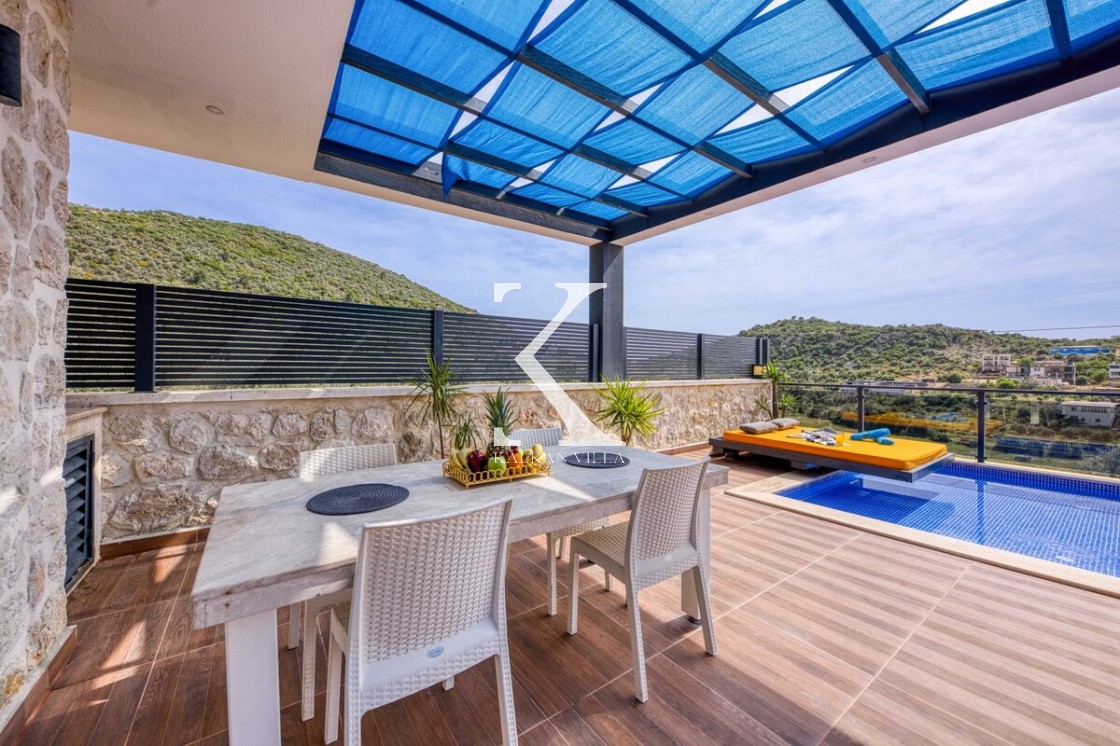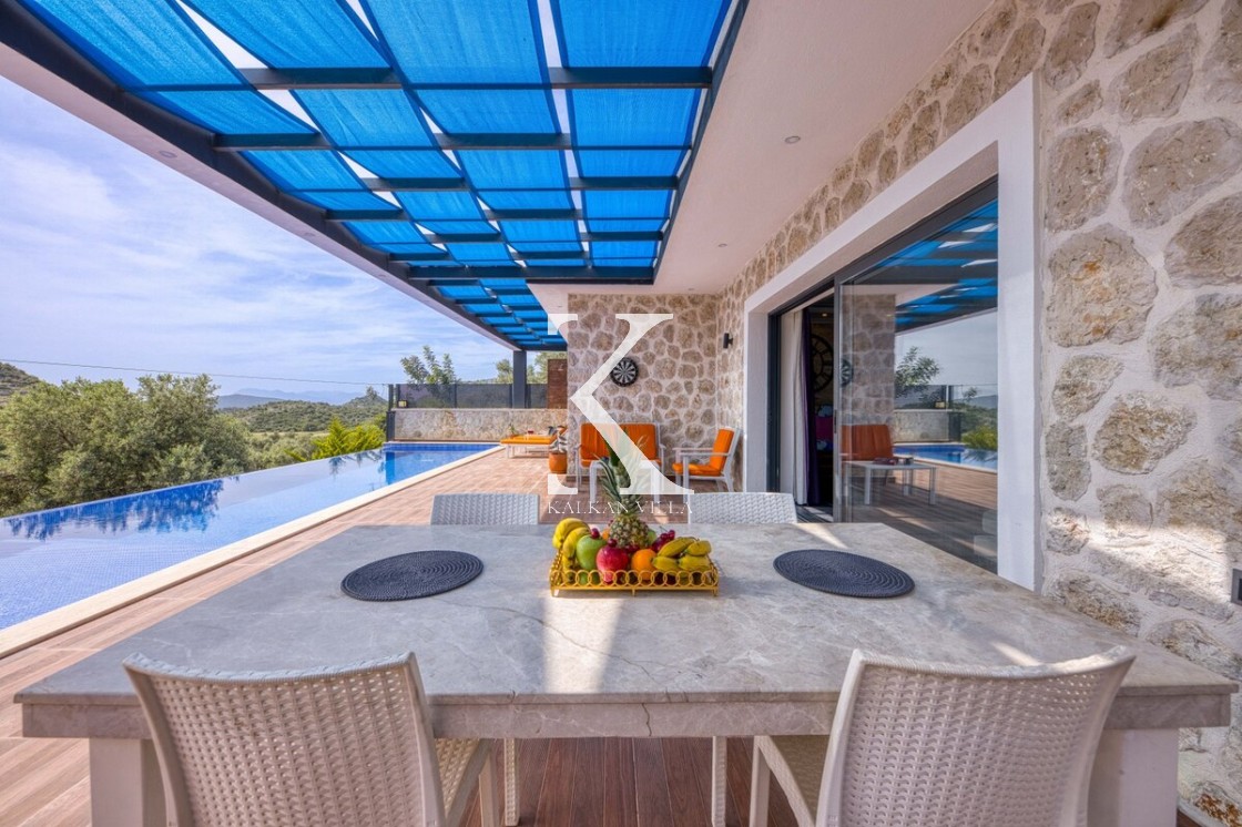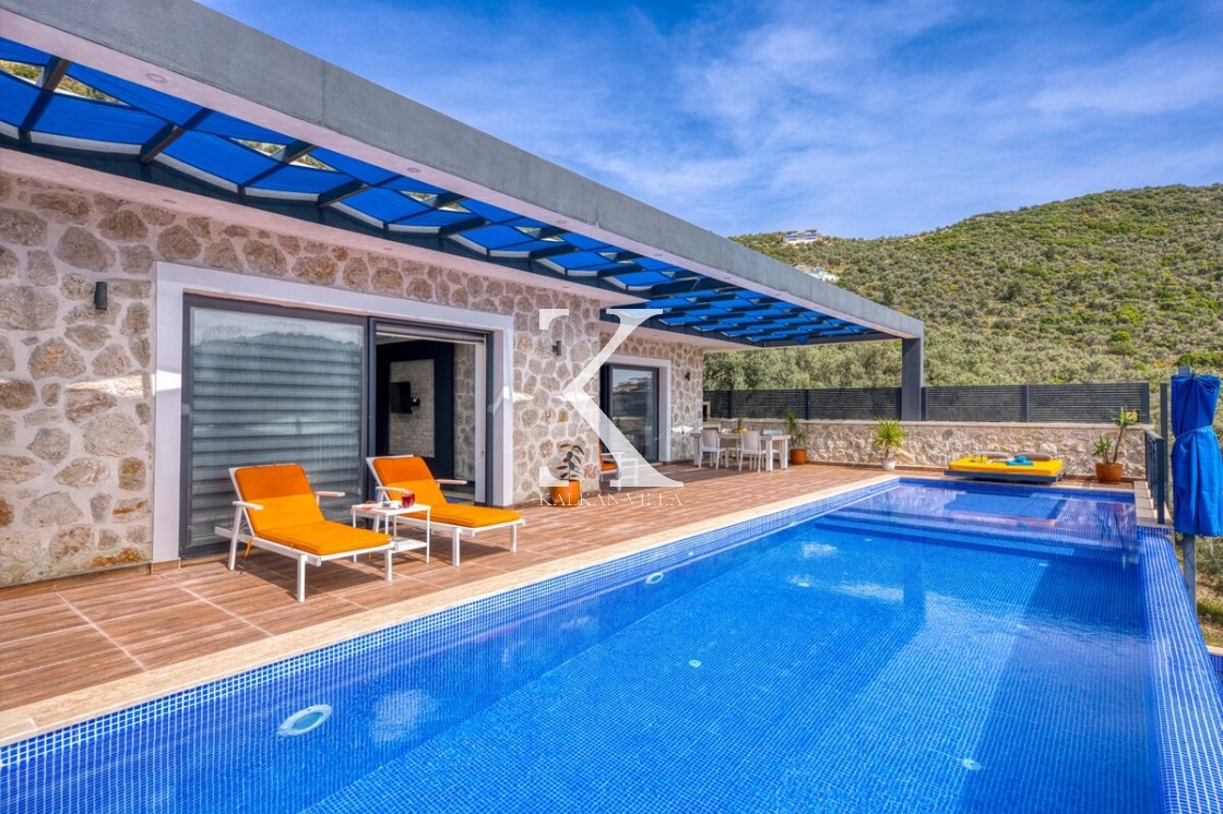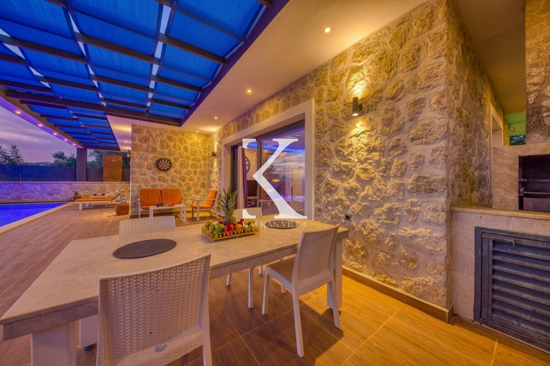 Taş mimarisiyle Akdeniz ruhunu yansıtan villa, modern minimalist detaylarıyla hem zarif hem de konforlu bir atmosfer sunar.