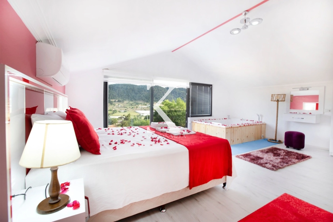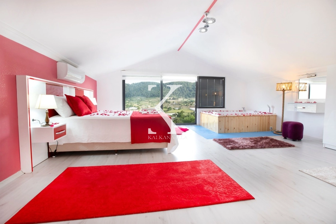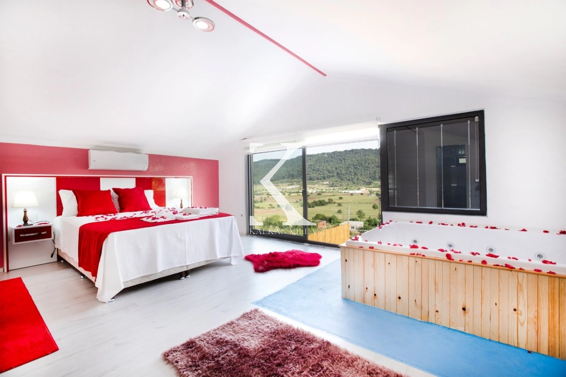 Villanın modern detaylarla tasarlanmış iç alanında yer alan jakuzi, tatilinize romantizm ve konfor katar.
