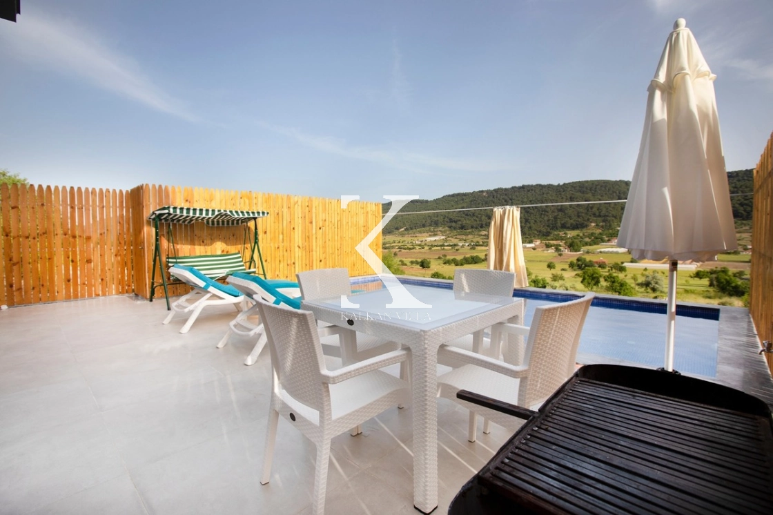 Geniş bahçesinde yer alan özel yüzme havuzu, şezlonglar, yemek alanı, oturma köşesi ve barbekü, doğa ile baş başa keyifli bir atmosfer yaratır.