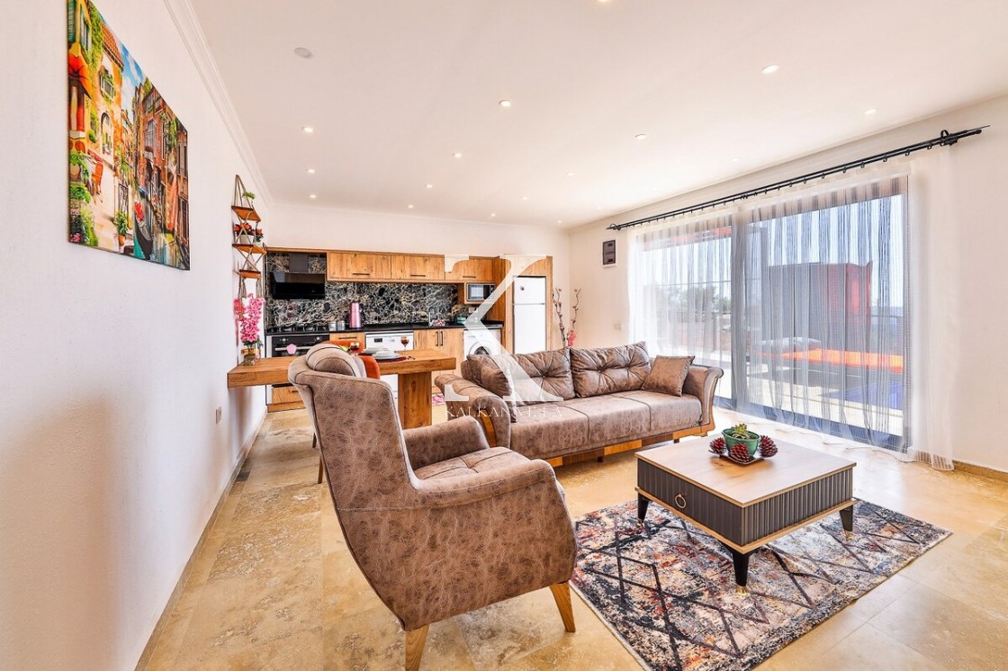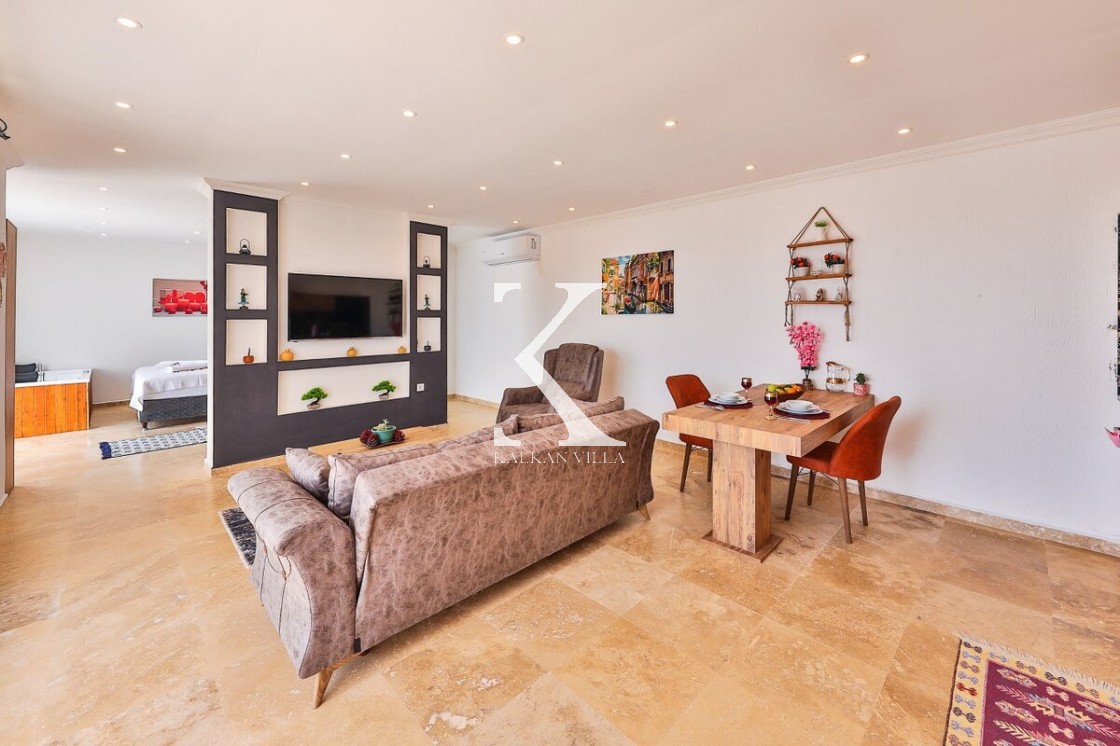 Salon doğrudan havuz terasına açılmakta, böylece Akdeniz’in eşsiz gün batımını evinizin içinden dahi izleyebilmenizi sağlar.