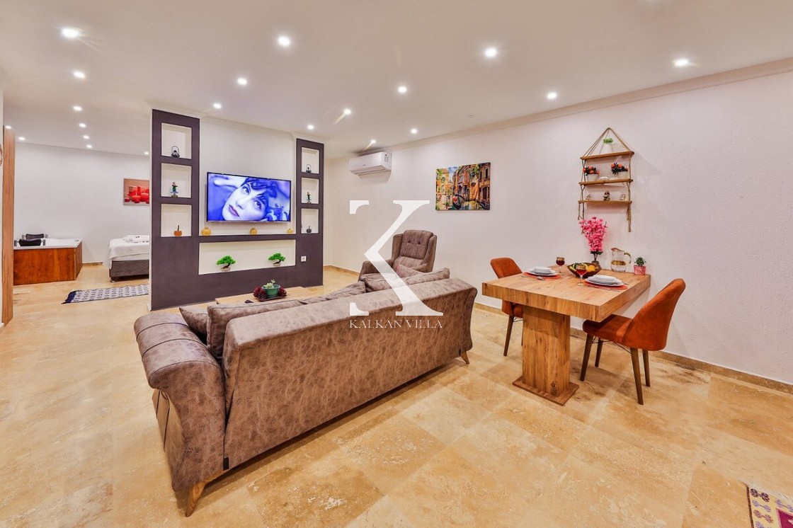 Aydınlık salon alanında konforlu oturma grubu, televizyon, DVD oynatıcı, uydu yayını, klima ve internet erişimi bulunmaktadır.