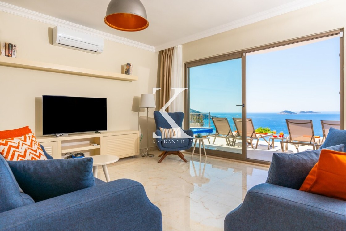 Deniz ve havuz manzaralı salonda klima, uydu alıcısı, TV ve konforlu oturma grubu bulunmaktadır. Salondan havuz kenarına direkt çıkış vardır ve salon da havuz katındadır.