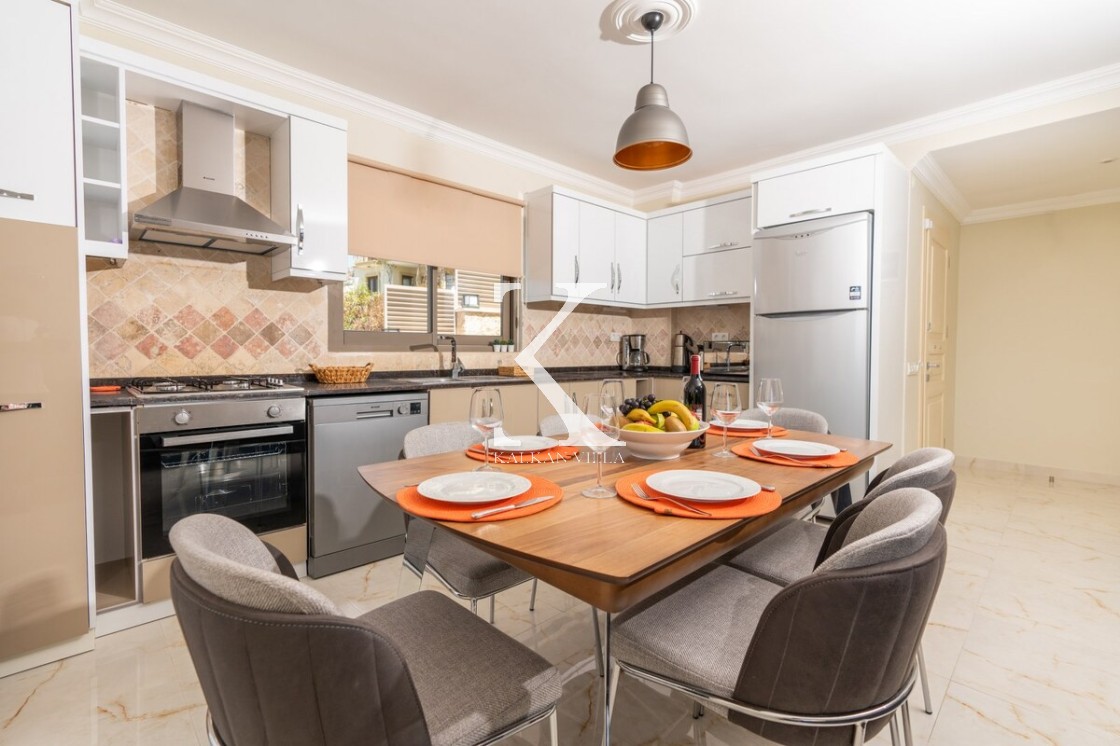 Villa Fabiola’nın modern Amerikan mutfağında; mikrodalga fırın, bulaşık makinesi, ankastre fırın, buzdolabı, çamaşır makinesi, ankastre 4’lü ocak, elektrikli su ısıtıcı, ekmek kızartma makinesi, tost makinesi, tencere–tava takımı, 12 kişilik yemek takımı, kaşık–çatal seti ve bardaklar bulunmaktadır. Mutfak, havuz katında yer alır.