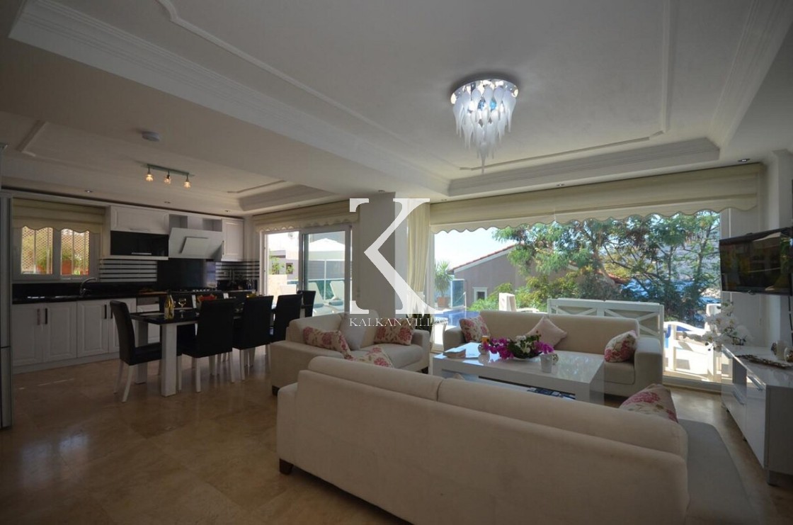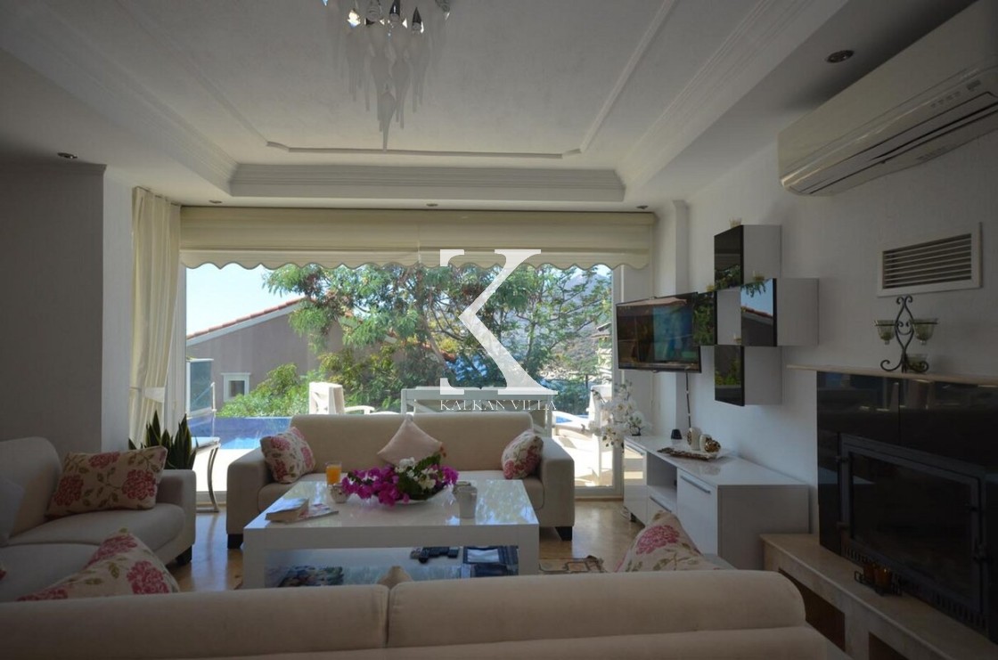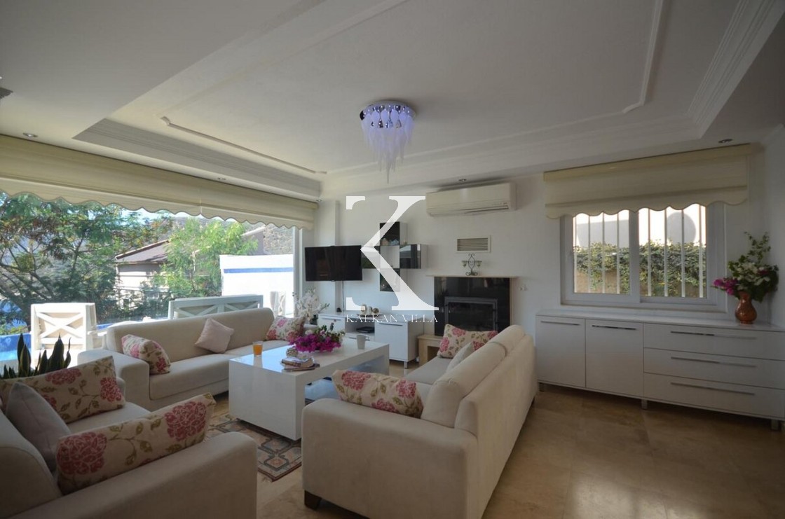 Açık plan ve şık oturma alanı; rahat koltuklar, uydu LCD TV, DVD/CD oynatıcı, şömine, yemek masası ve sandalyeler. Havuz terasına direkt çıkış.