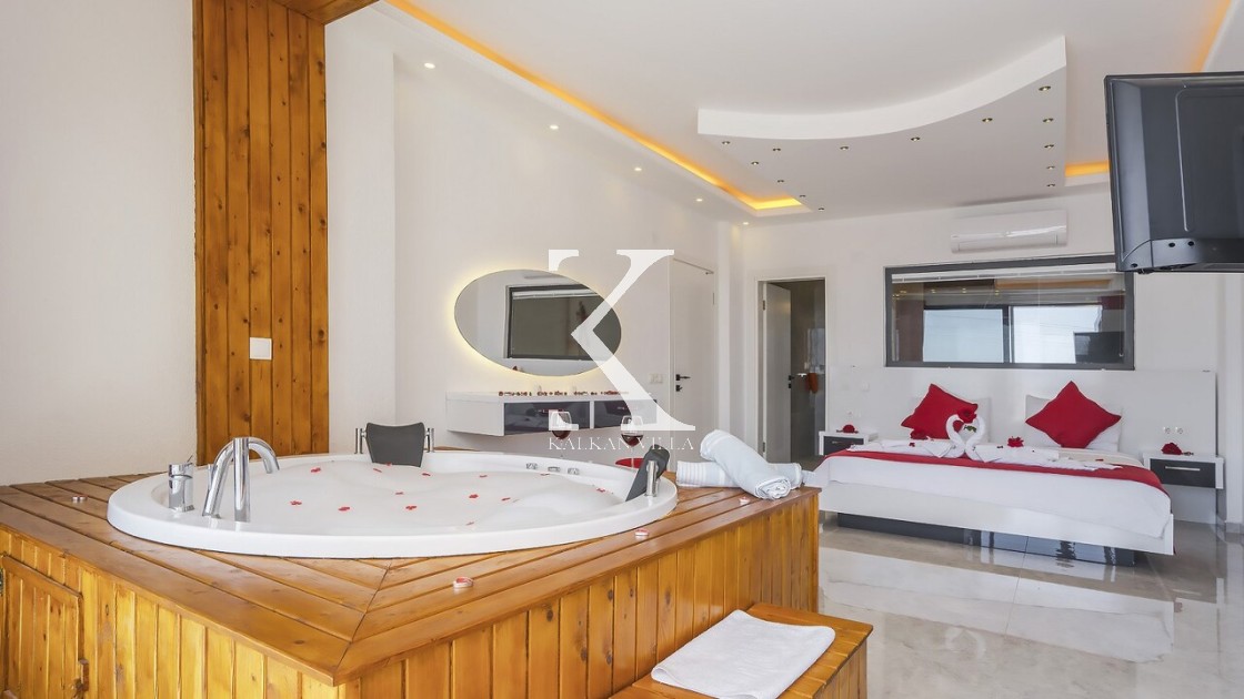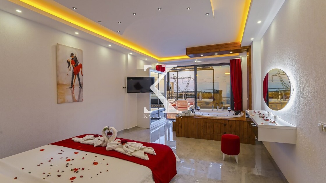 1 adet çift kişilik yatak, elbise dolabı, komodin, klima, TV, jakuzi, sauna, banyo & WC.