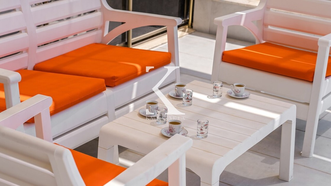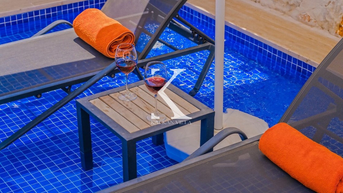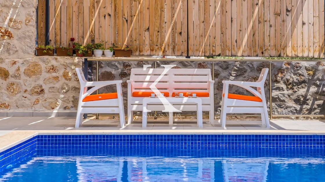 Havuz terası korunaklı yapıdadır; mahremiyet arayan misafirler için uygun olup şezlong, oturma alanları ve yemek masası ile donatılmıştır.