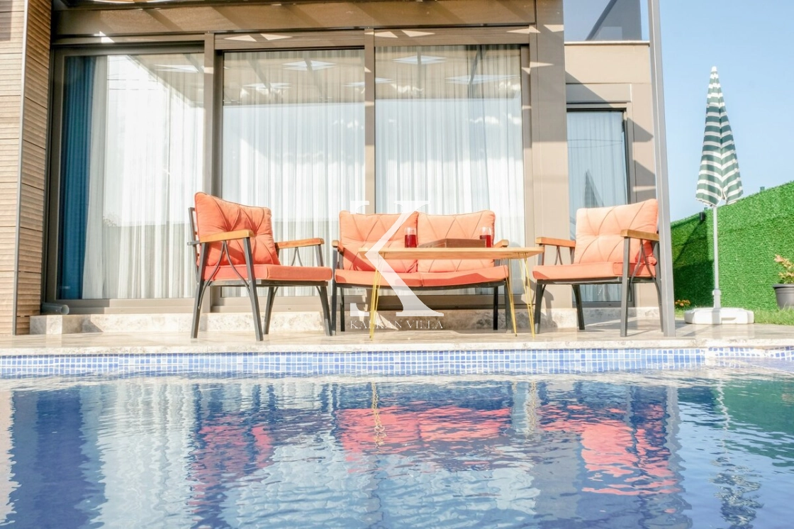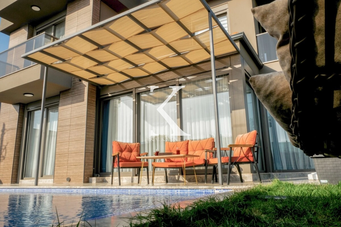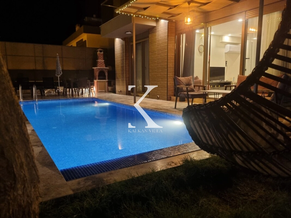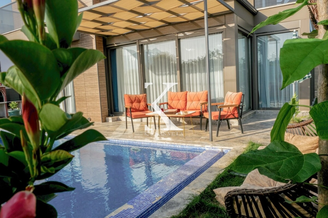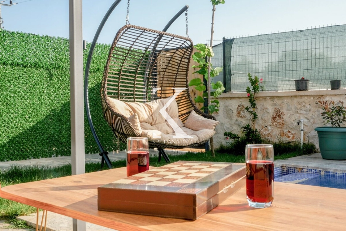Tamamen dışarıdan görünmeyen korunaklı bahçe ve özel yüzme havuzu, misafirlerine maksimum mahremiyet sağlar. Geniş havuz terasında şezlonglar, salıncak, yemek masası ve barbekü alanı bulunmaktadır.