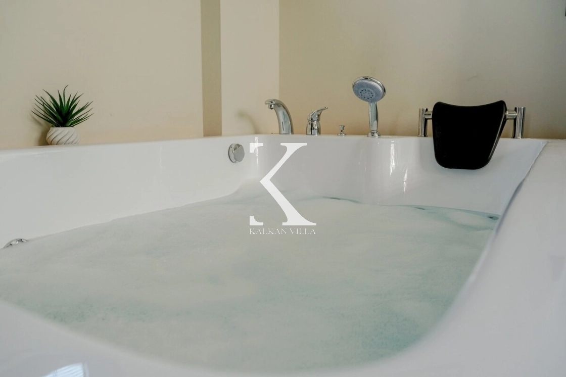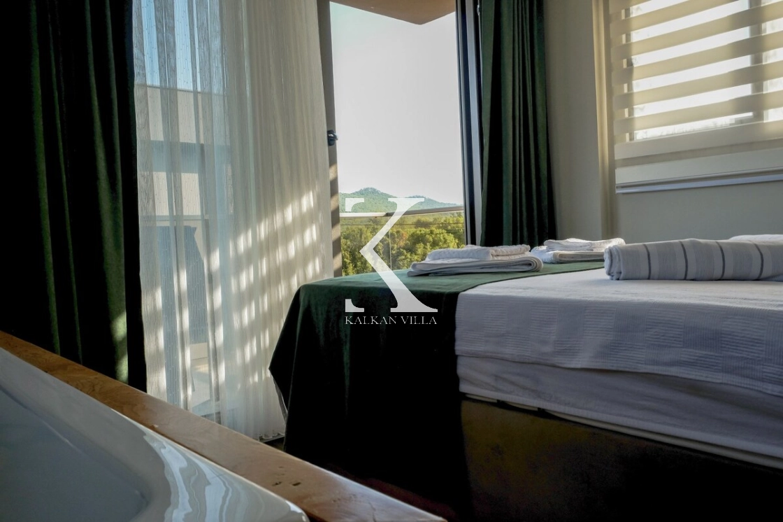 Yatak odalarından birinde bulunan özel jakuzi, villayı Kalkan’daki standart kiralık villalardan ayıran lüks detaylardan biridir.