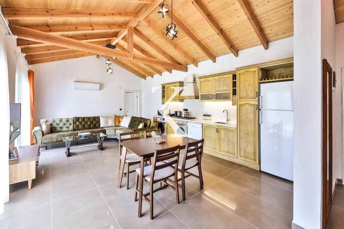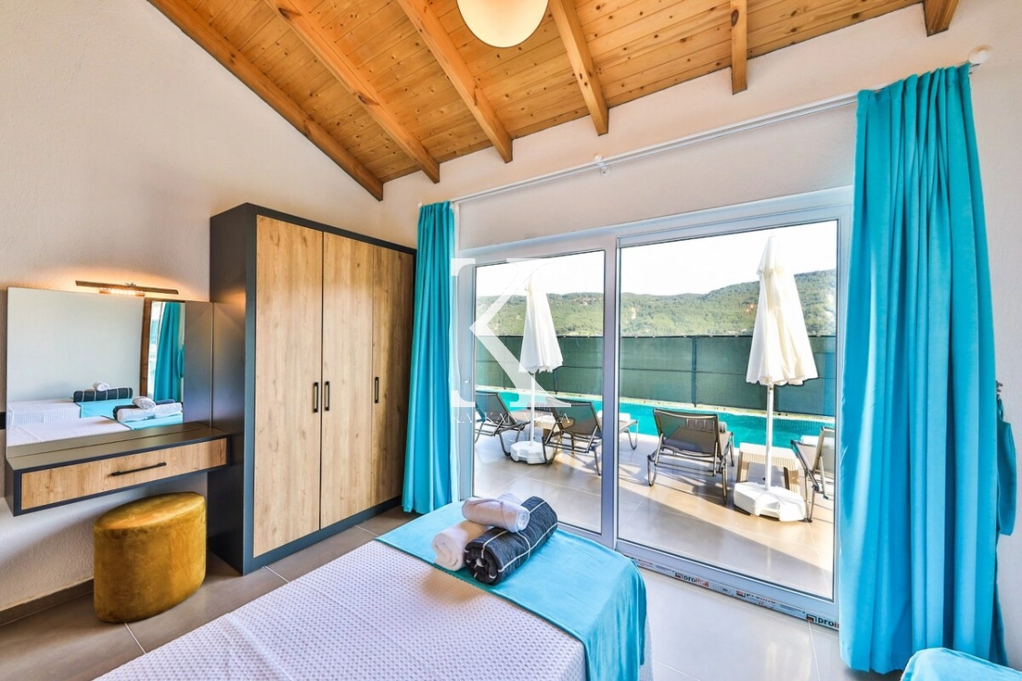 Modern ve kaliteli eşyalarla dekore edilmiş salonda konforlu oturma grubu, TV, TV ünitesi, DVD oynatıcı, klima ve internet bulunmaktadır. Salondan havuz terasına doğrudan çıkış vardır.