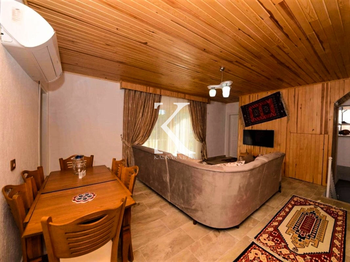 Eşsiz doğa manzarasına sahip salon bölümünde konforlu oturma grubu, TV, klima ve sehpa yer almaktadır.