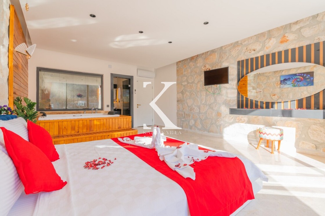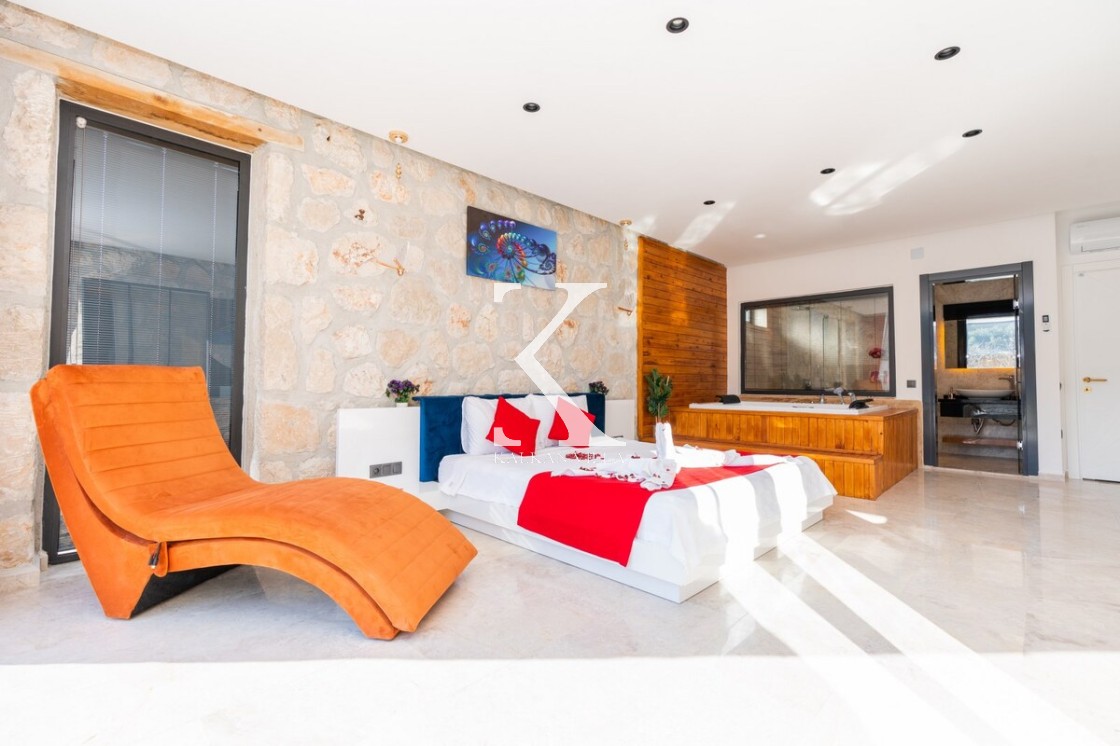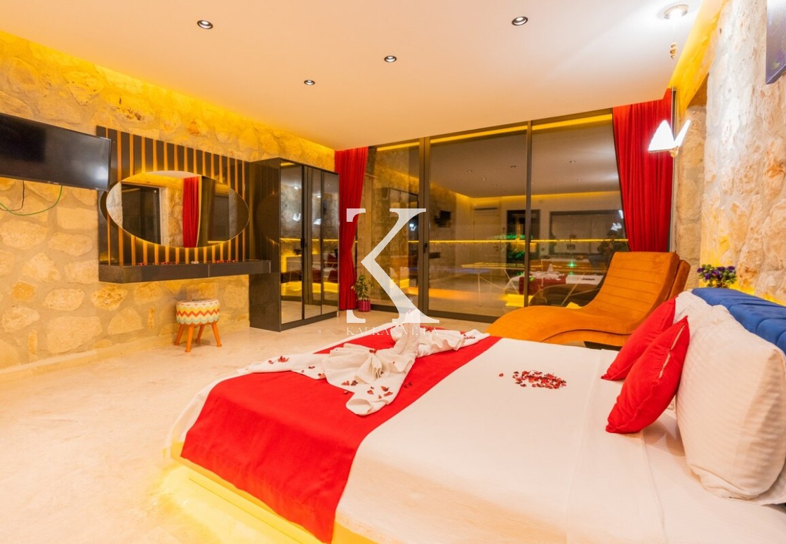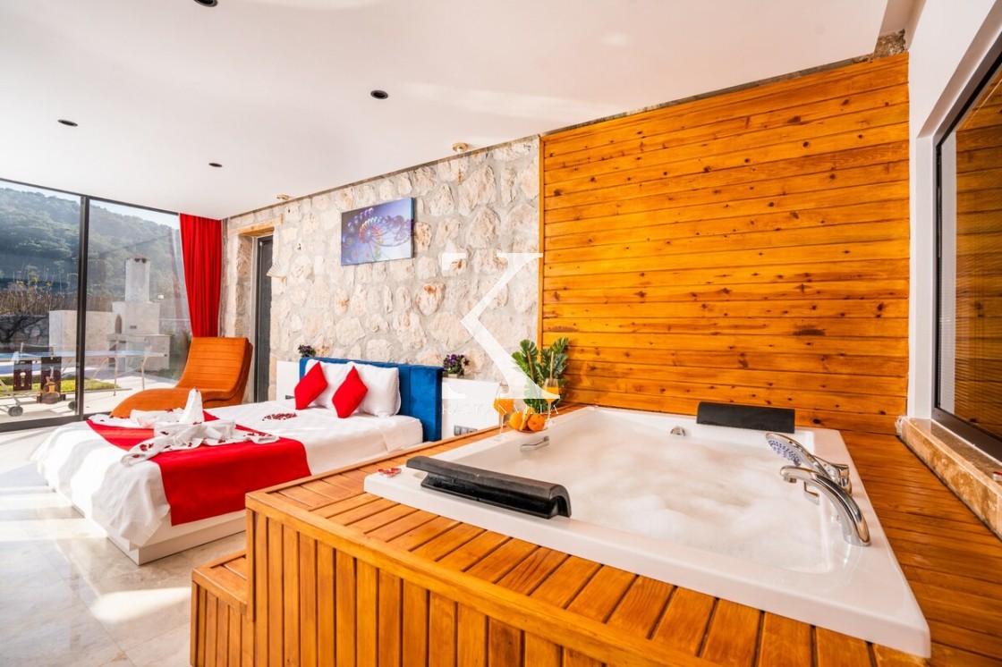 Çift kişilik yatak, oda içi jakuzi, gardırop, komodin, makyaj masası, klima, banyo/WC.