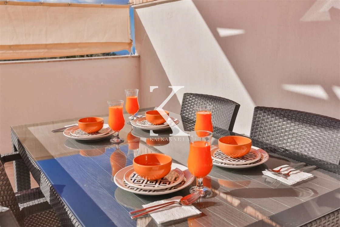 Modern beyaz dolaplarla dizayn edilmiş Amerikan mutfak içerisinde buzdolabı, bulaşık makinesi, ocak, fırın, su ısıtıcısı, tost makinesi, 4 kişilik yemek masası, yemek takımı ve yemek pişirme araç gereçleri bulunmaktadır.