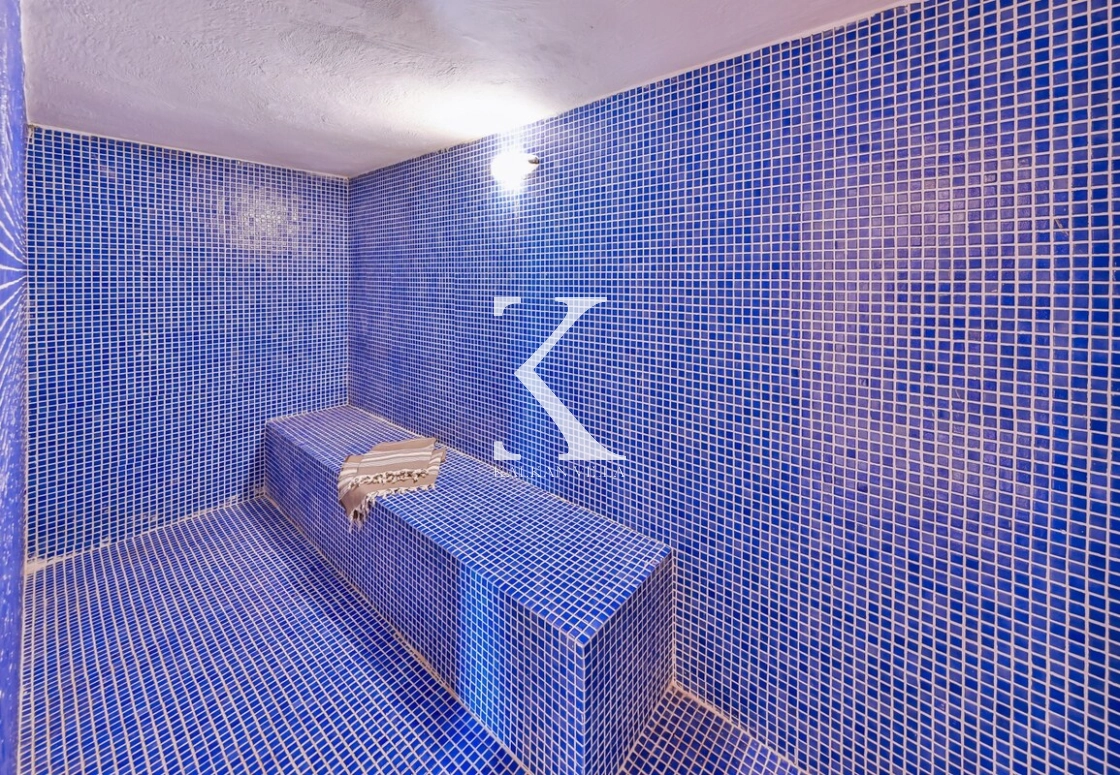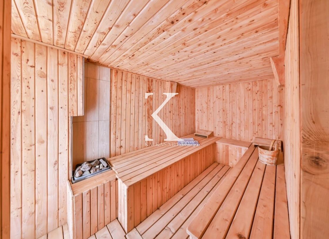 Villanın dış alanında iki ayrı yüzme havuzu, jakuzili çocuk havuzu, sauna, buhar odası, masa tenisi, masa futbolu ve eliptik bisiklet gibi eğlence ve dinlenme olanakları yer alır.