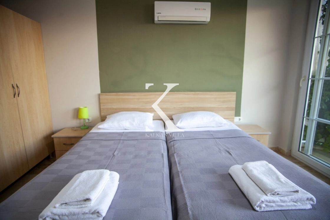 1 çift kişilik + 1 tek kişilik yatak, elbise dolabı, klima, özel banyo